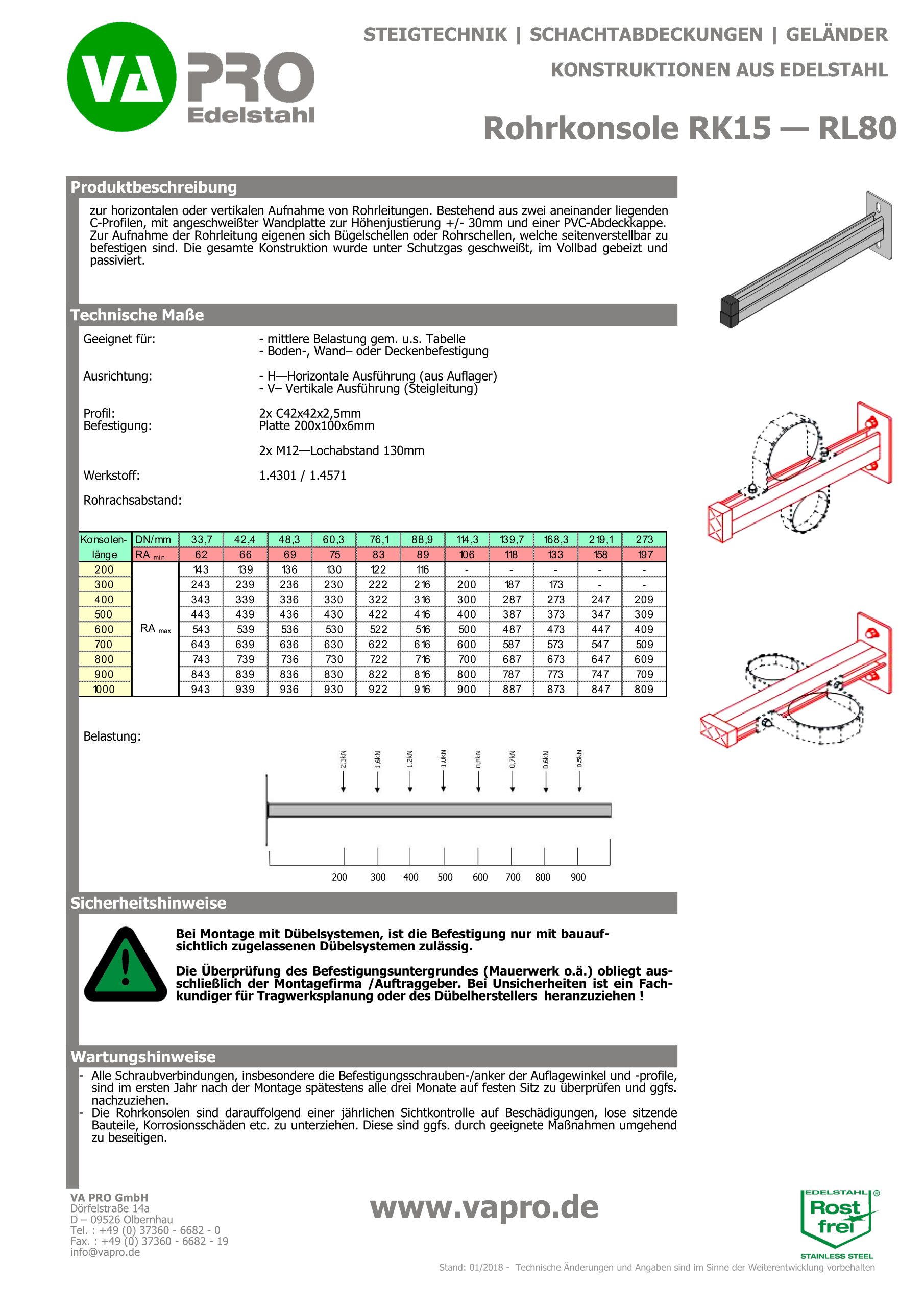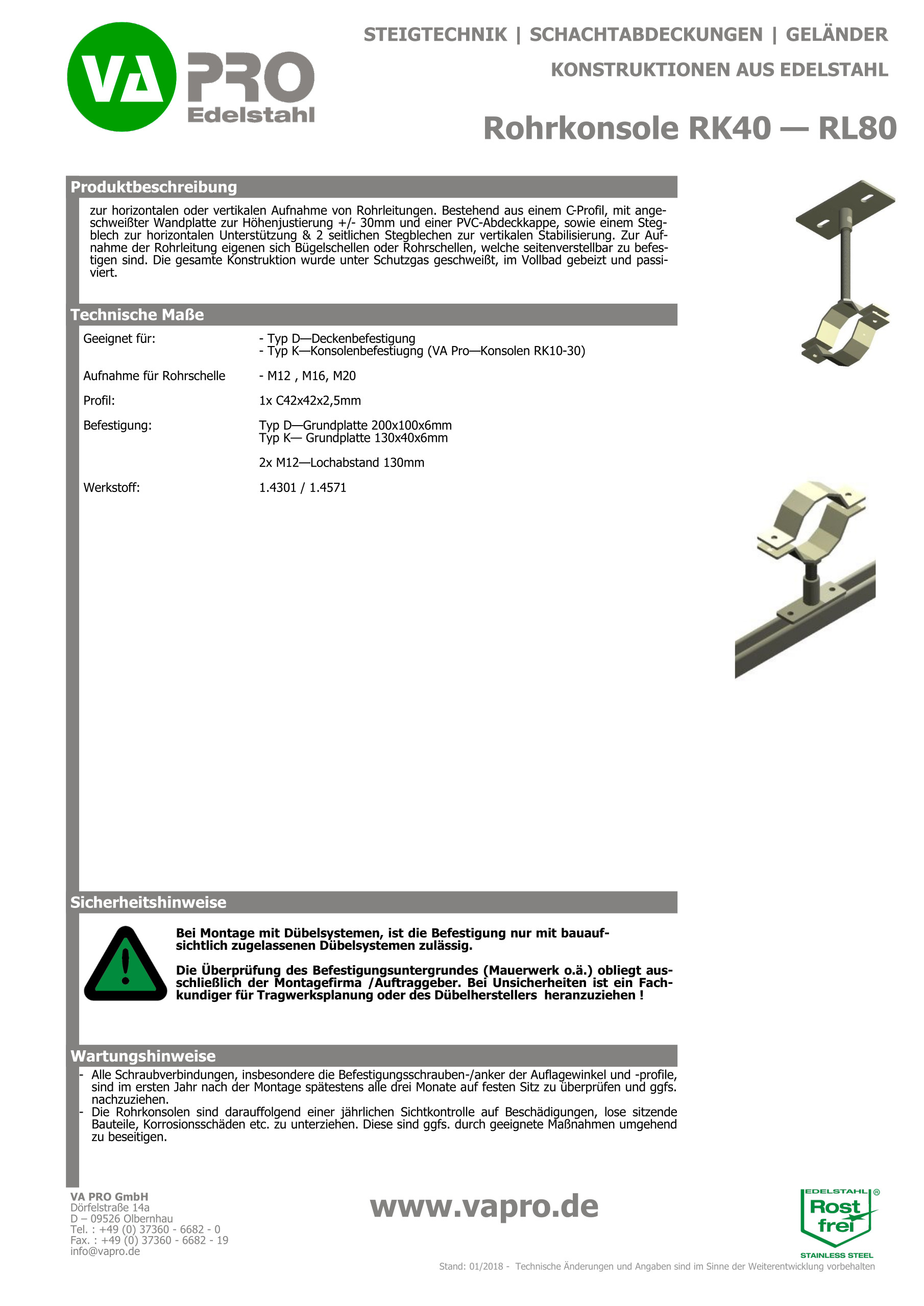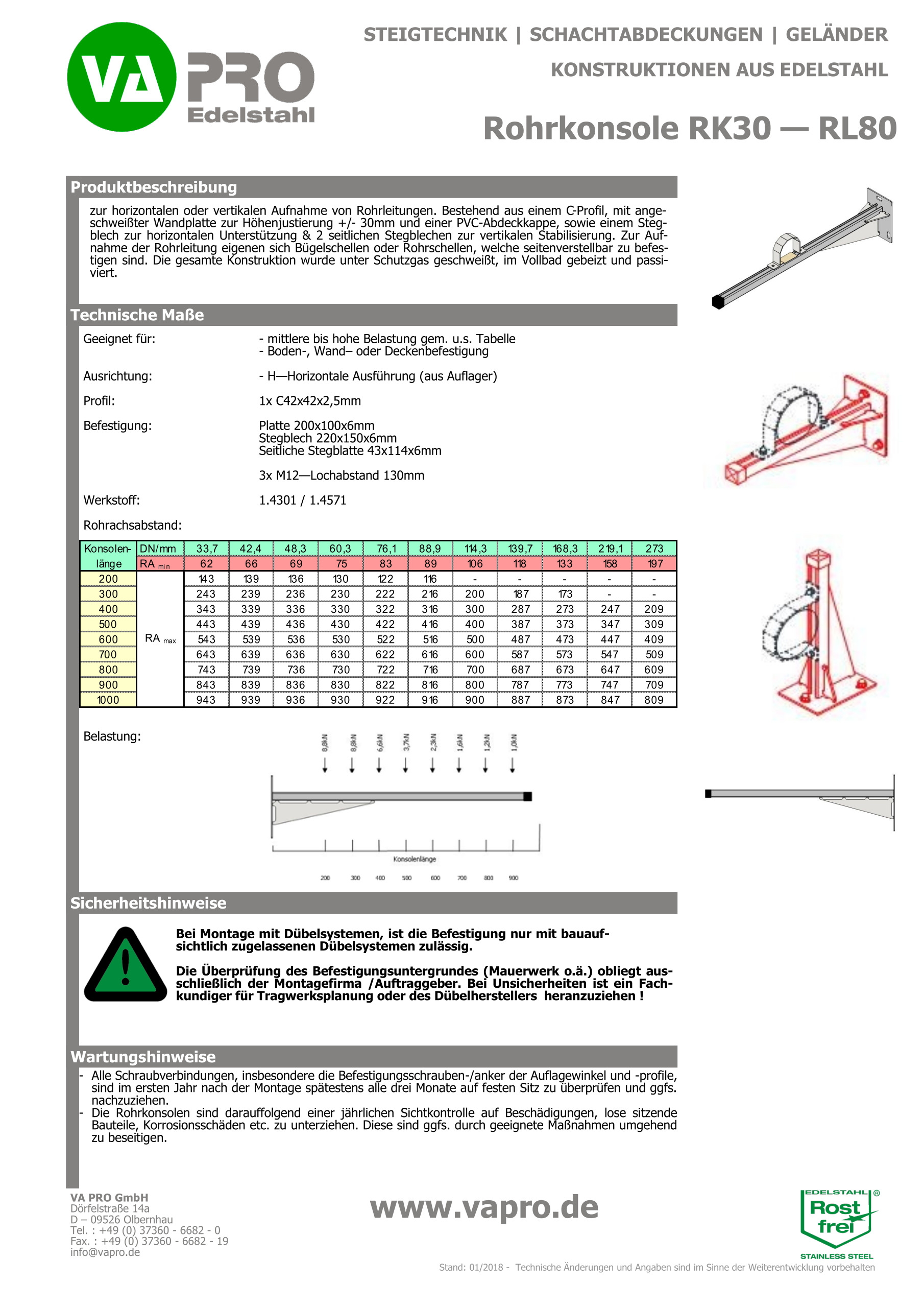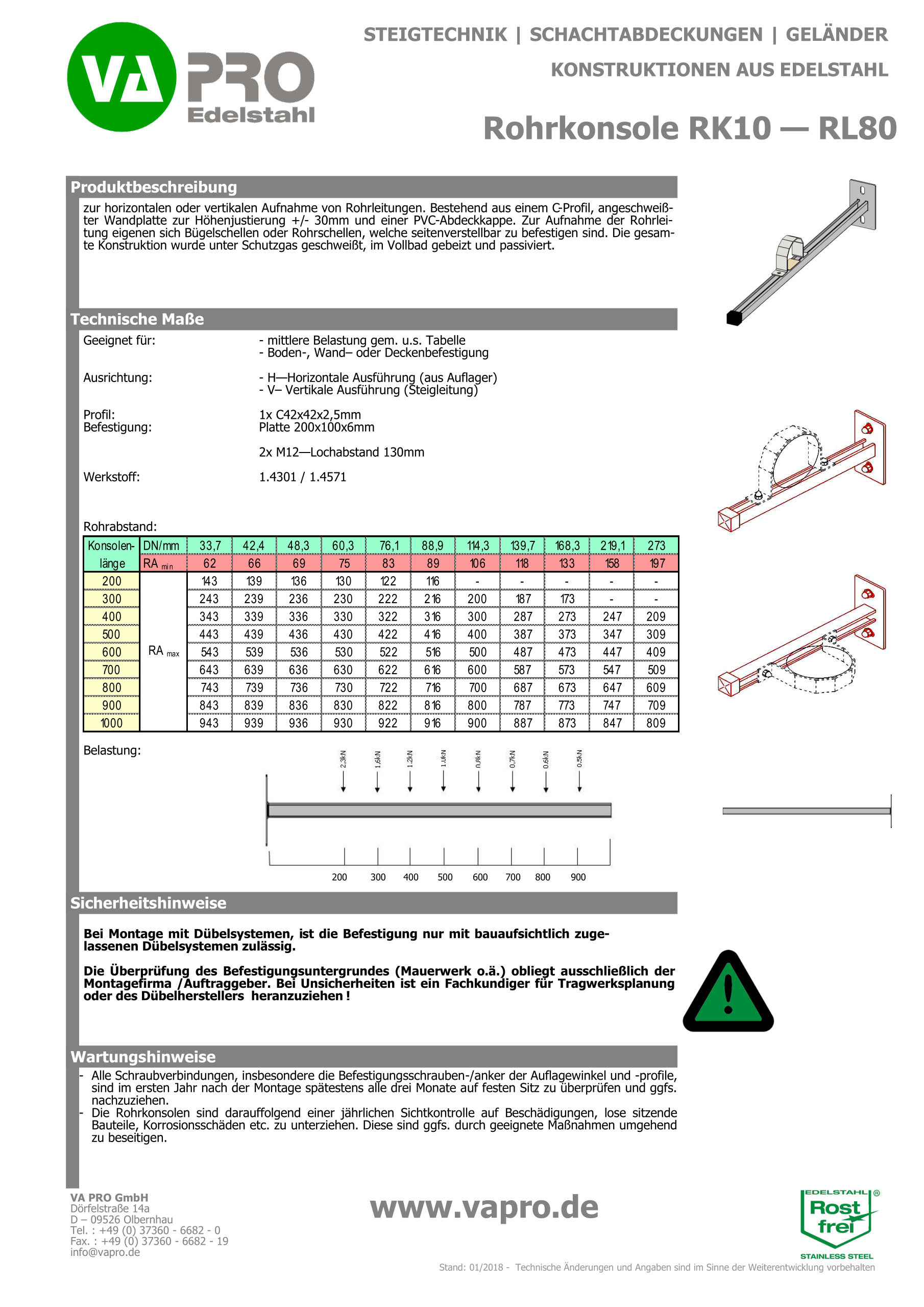 Beschreibung: zur horizontalen oder vertikalen Aufnahme von Rohrleitungen. Bestehend aus 2 an einander geschweißten C-Profilen, angeschweißter Wandplatte zur Höhenjustierung +/- 30mm und einer PVC-Abdeckkappe. Zur Aufnahme der Rohrleitung eigenen sich Bügelschellen oder Rohrschellen, welche seitenverstellbar zu befestigen sind. Die gesamte Konstruktion wurde unter Schutzgas geschweißt, im Vollbad gebeizt und passiviert.