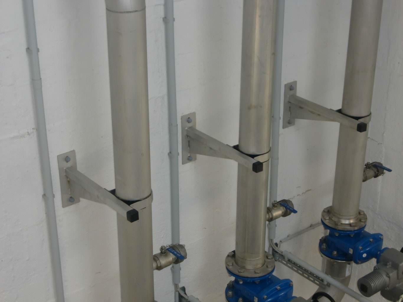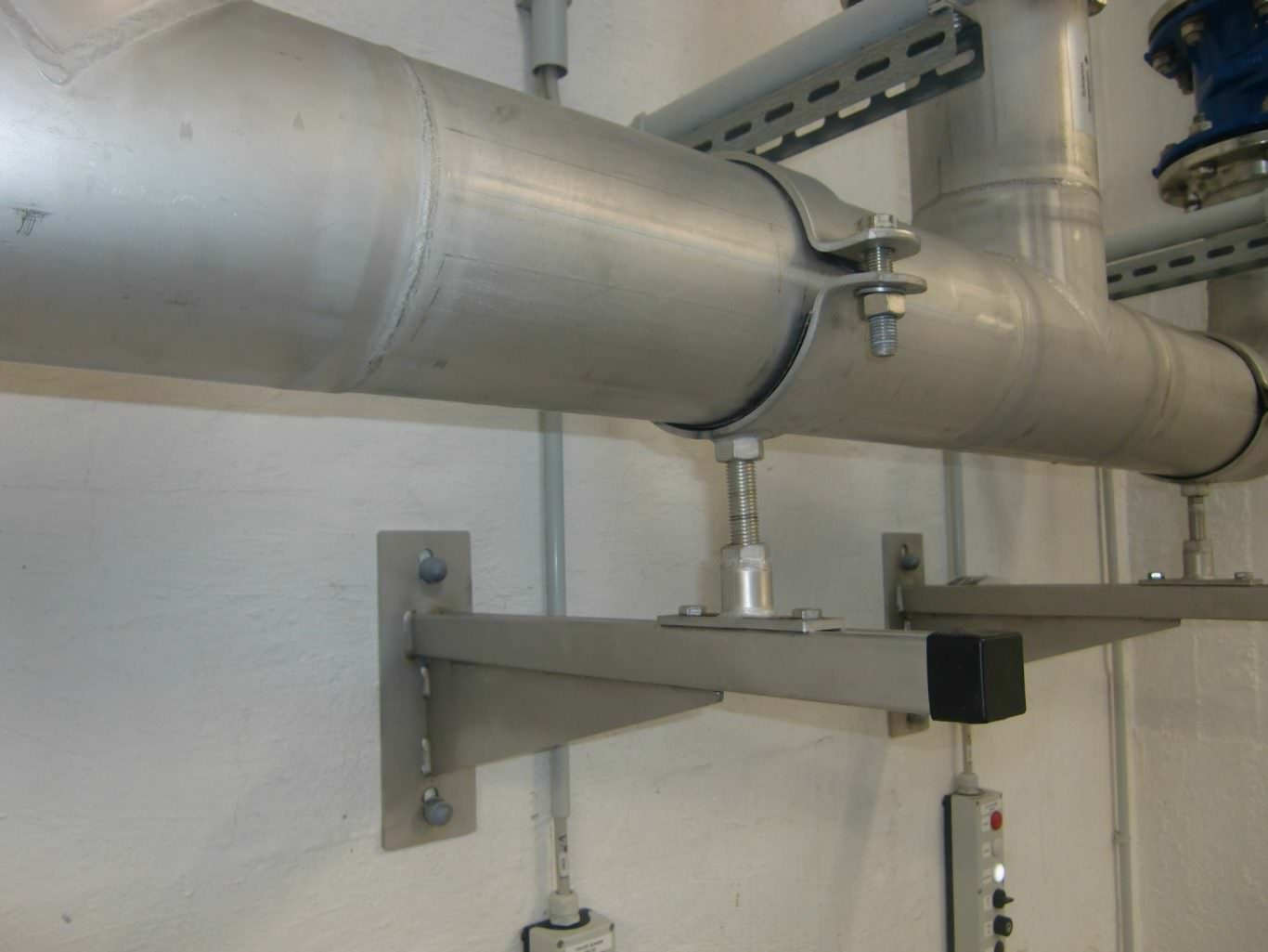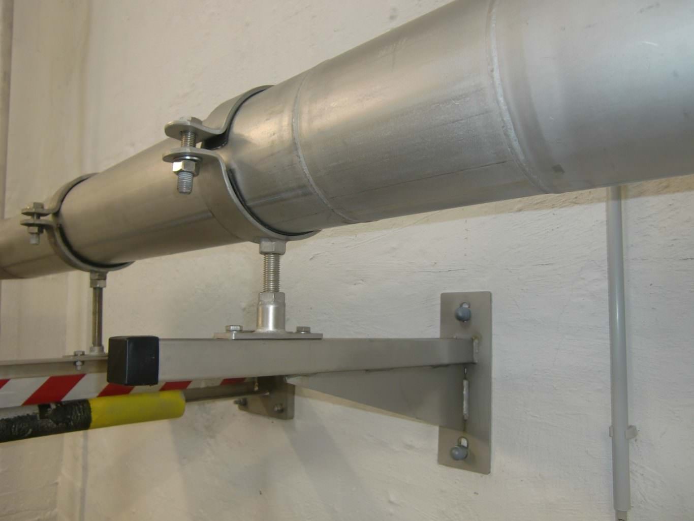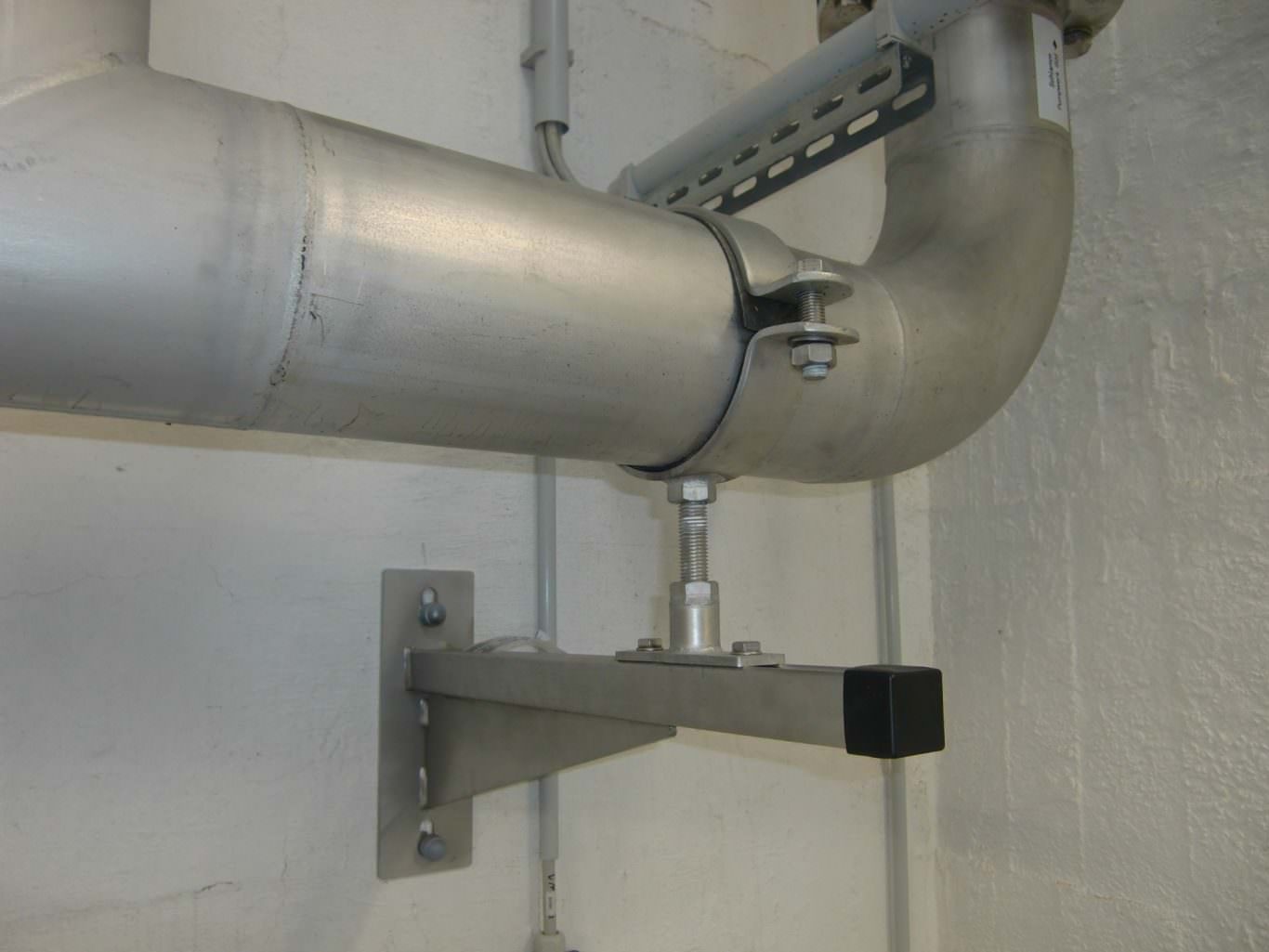 Beschreibung: zur horizontalen oder vertikalen Aufnahme von Rohrleitungen. Bestehend aus einem C-Profil, angeschweißter Wandplatte zur Höhenjustierung +/- 30mm und einer PVC-Abdeckkappe. Zur Aufnahme der Rohrleitung eigenen sich Bügelschellen oder Rohrschellen, welche seitenverstellbar zu befestigen sind. Die gesamte Konstruktion wurde unter Schutzgas geschweißt, im Vollbad gebeizt und passiviert.