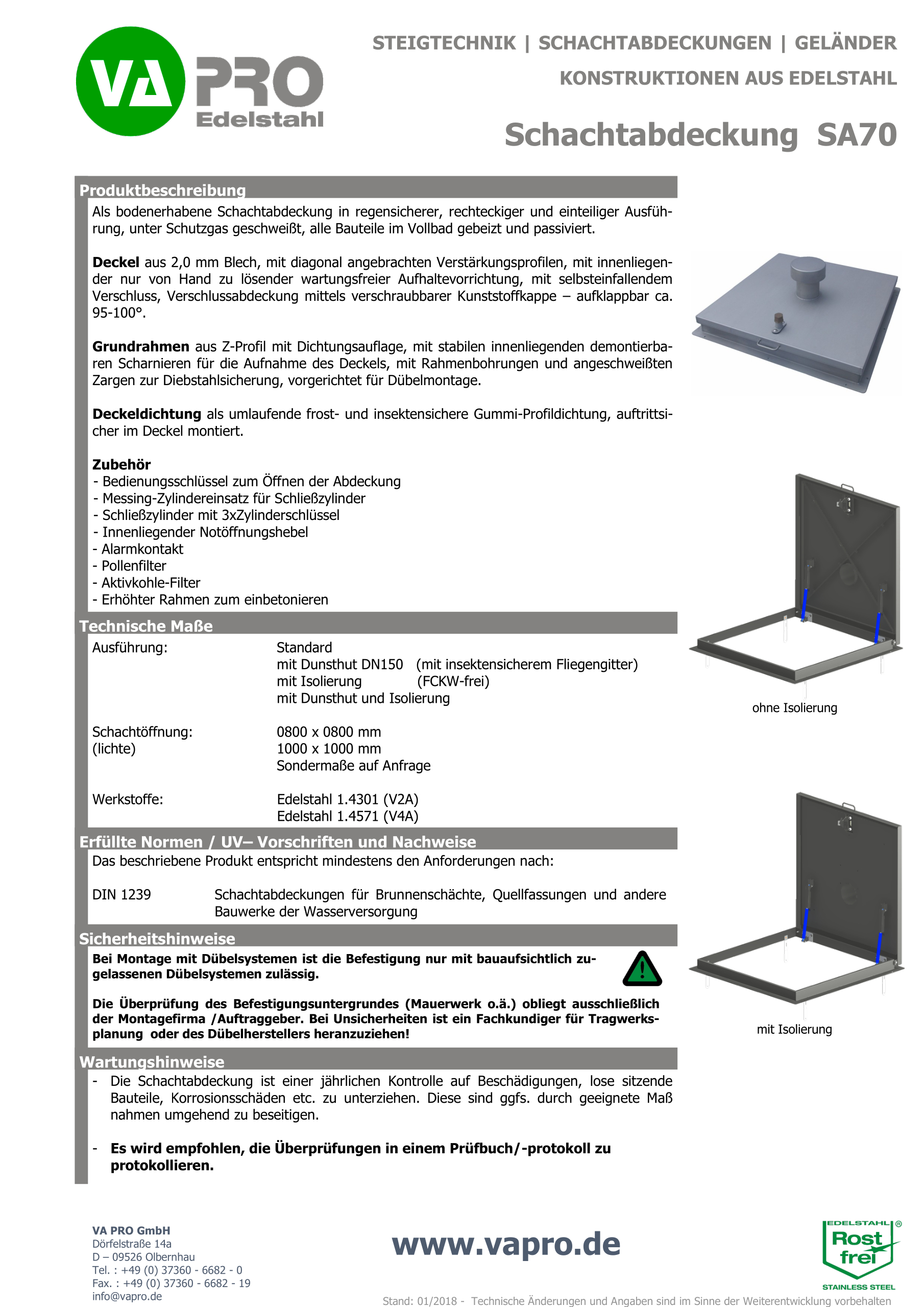Als bodenerhabene Schachtabdeckung in regensicherer, rechteckiger und einteiliger Ausführung, unter Schutzgas geschweißt, alle Bauteile im Vollbad gebeizt und passiviert.