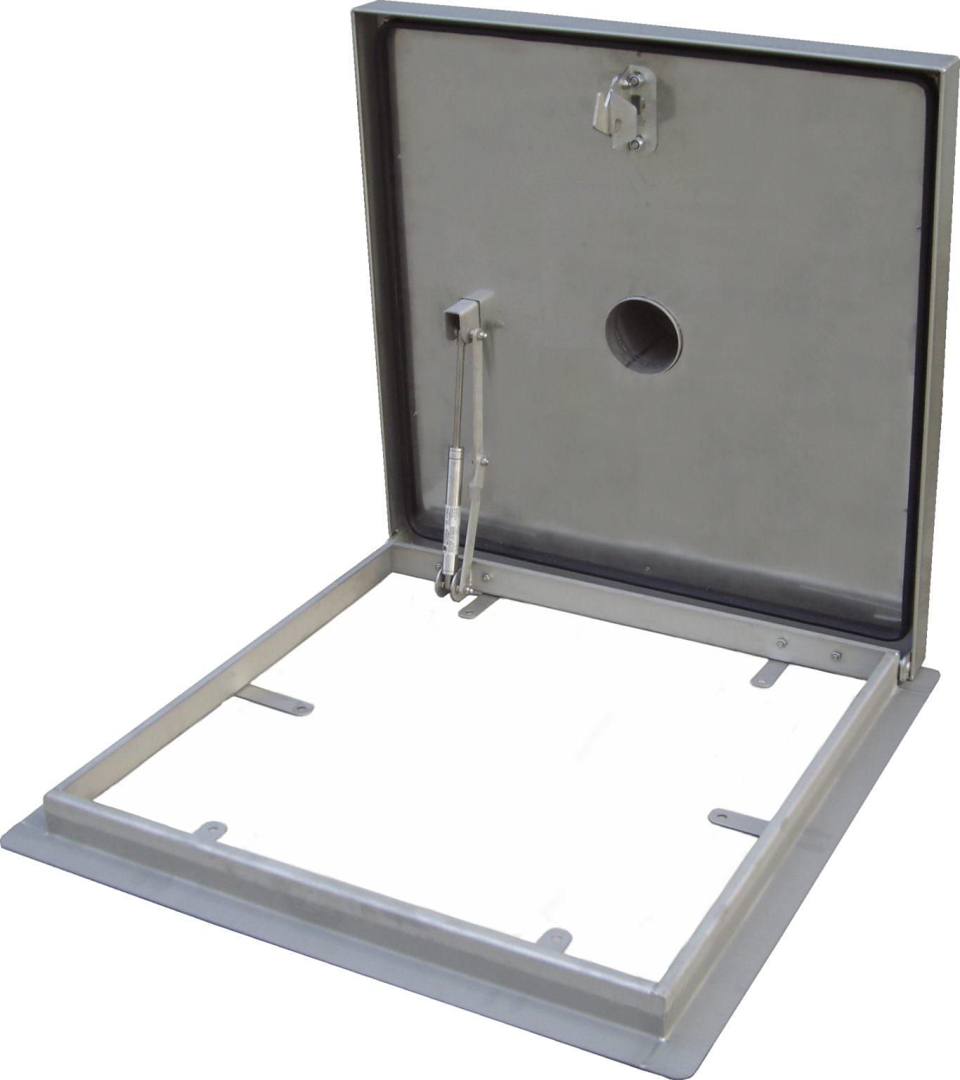 Grundrahmen: aus Z-Profil mit Dichtungsauflage, mit stabilen innenliegenden demontierbaren Scharnieren für die Aufnahme des Deckels, mit Rahmenbohrungen und angeschweißten Zargen zur Diebstahlsicherung, vorgerichtet für Dübelmontage.