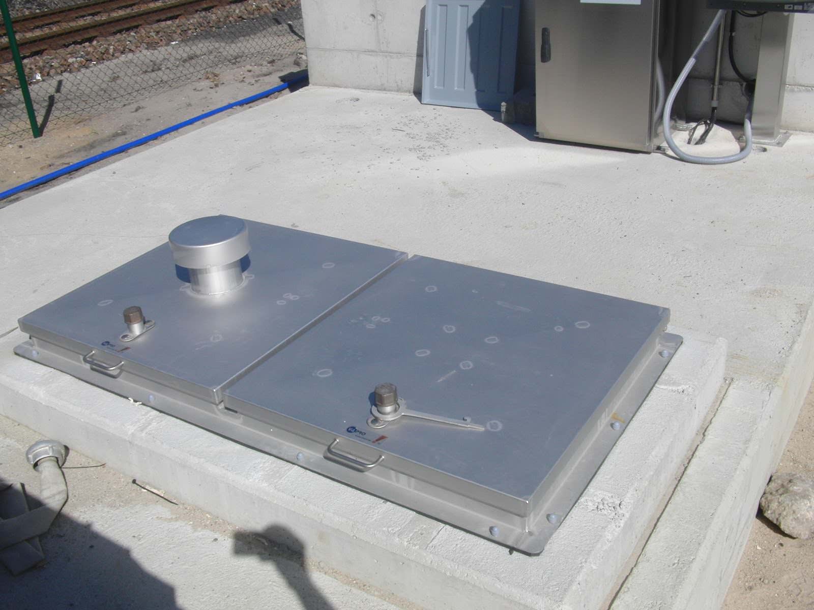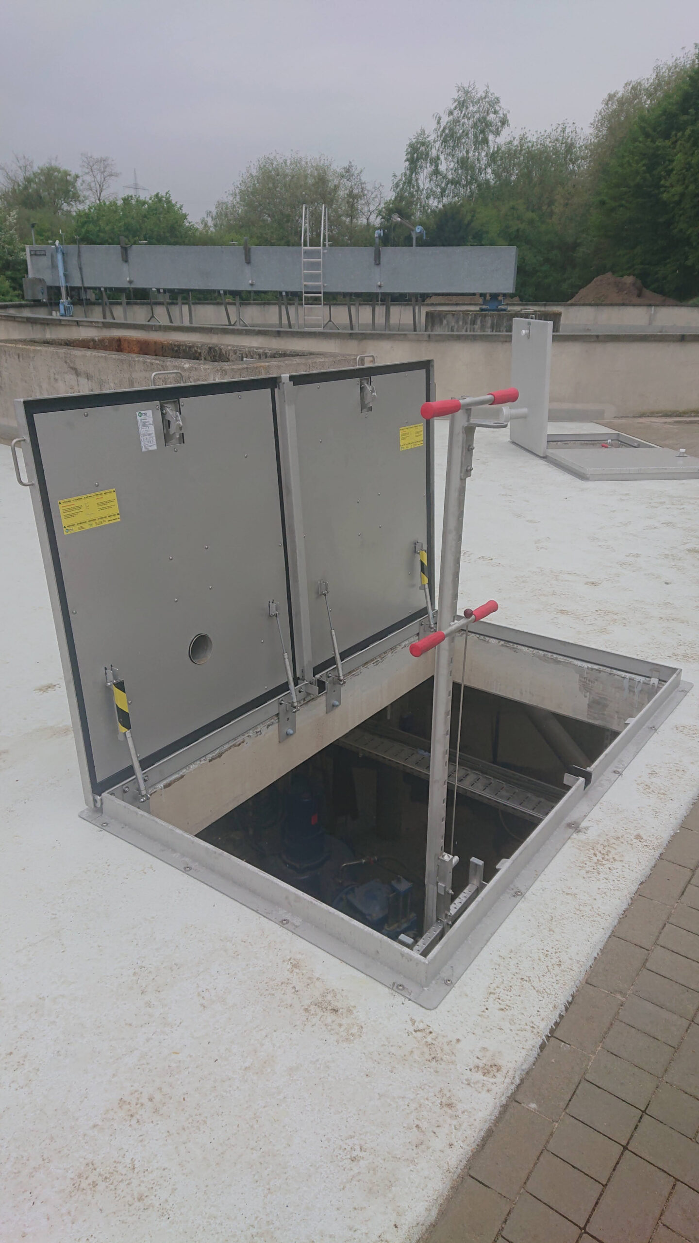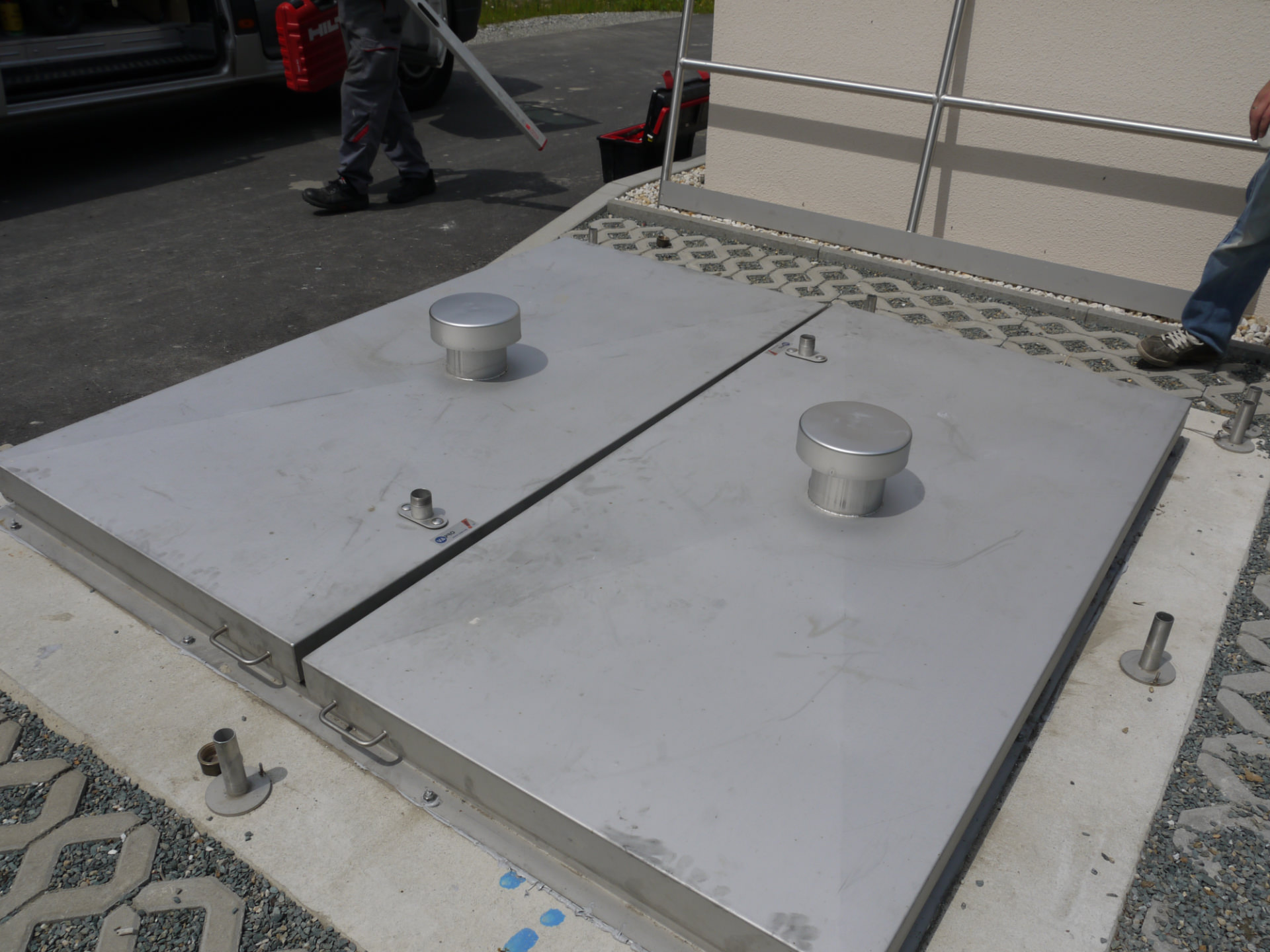 Als bodenerhabene Schachtabdeckung in regensicherer, rechteckiger Ausführung, unter Schutzgas geschweißt, alle Bauteile im Vollbad gebeizt und passiviert. 2-teilige Ausführung, gegeneinander geklappt mit demontierbaren Mittelstegen.