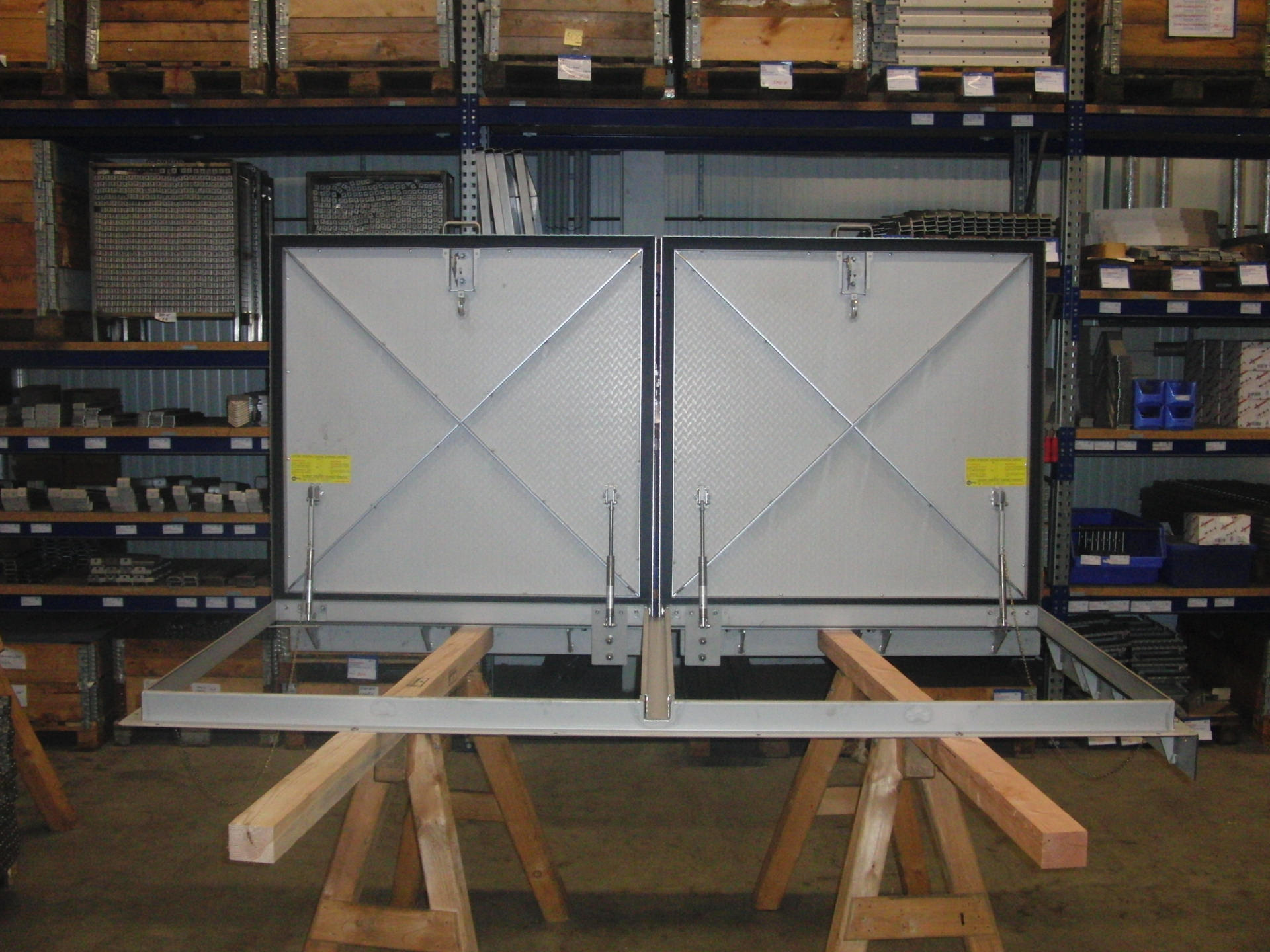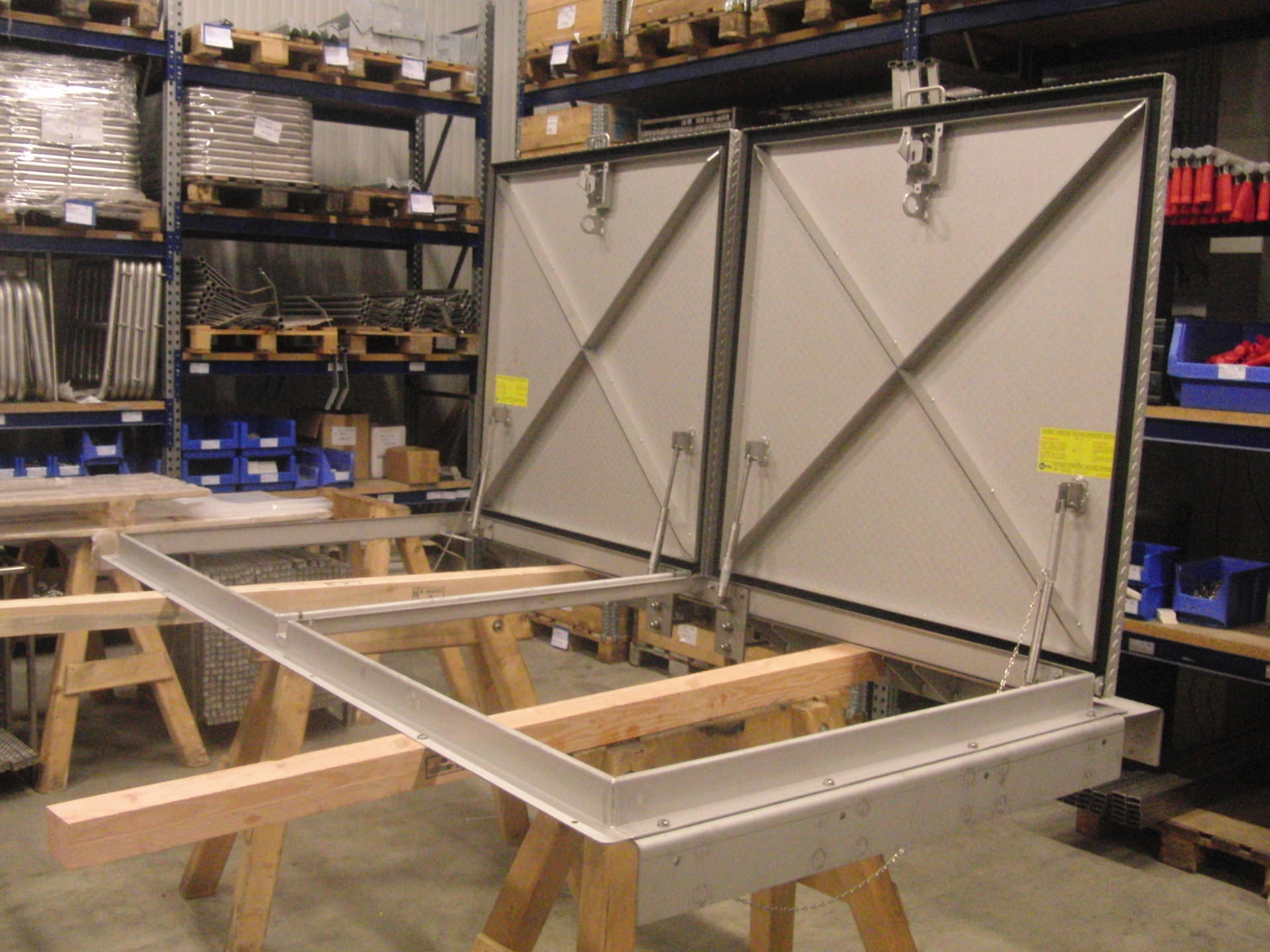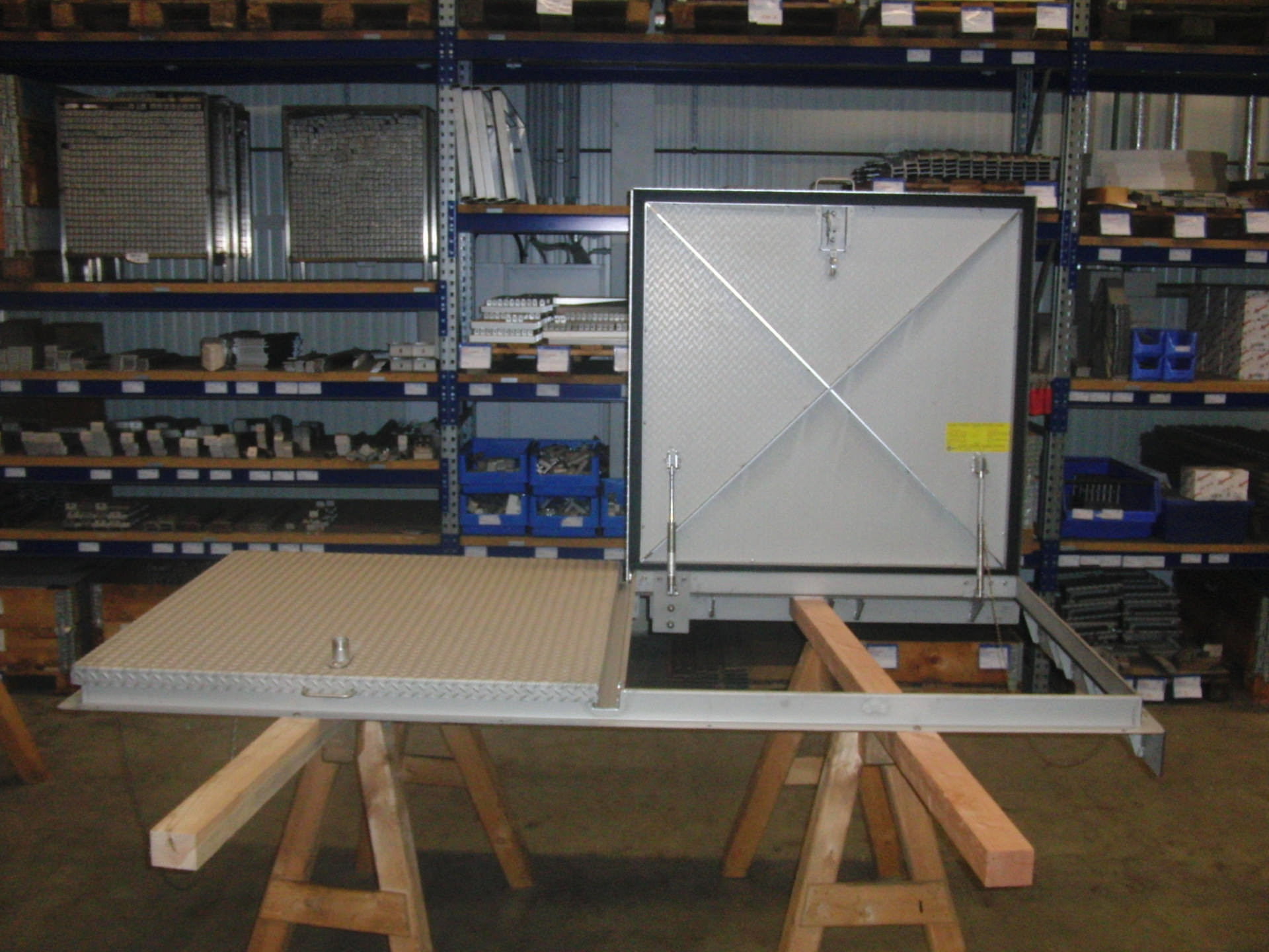 Grundrahmen: aus Z-Profil mit Dichtungsauflage, mit stabilen innenliegenden demontierbaren Scharnieren für die Aufnahme des Deckels, mit Rahmenbohrungen und angeschweißten Zargen zur Diebstahlsicherung, vorgerichtet für Dübelmontage.
