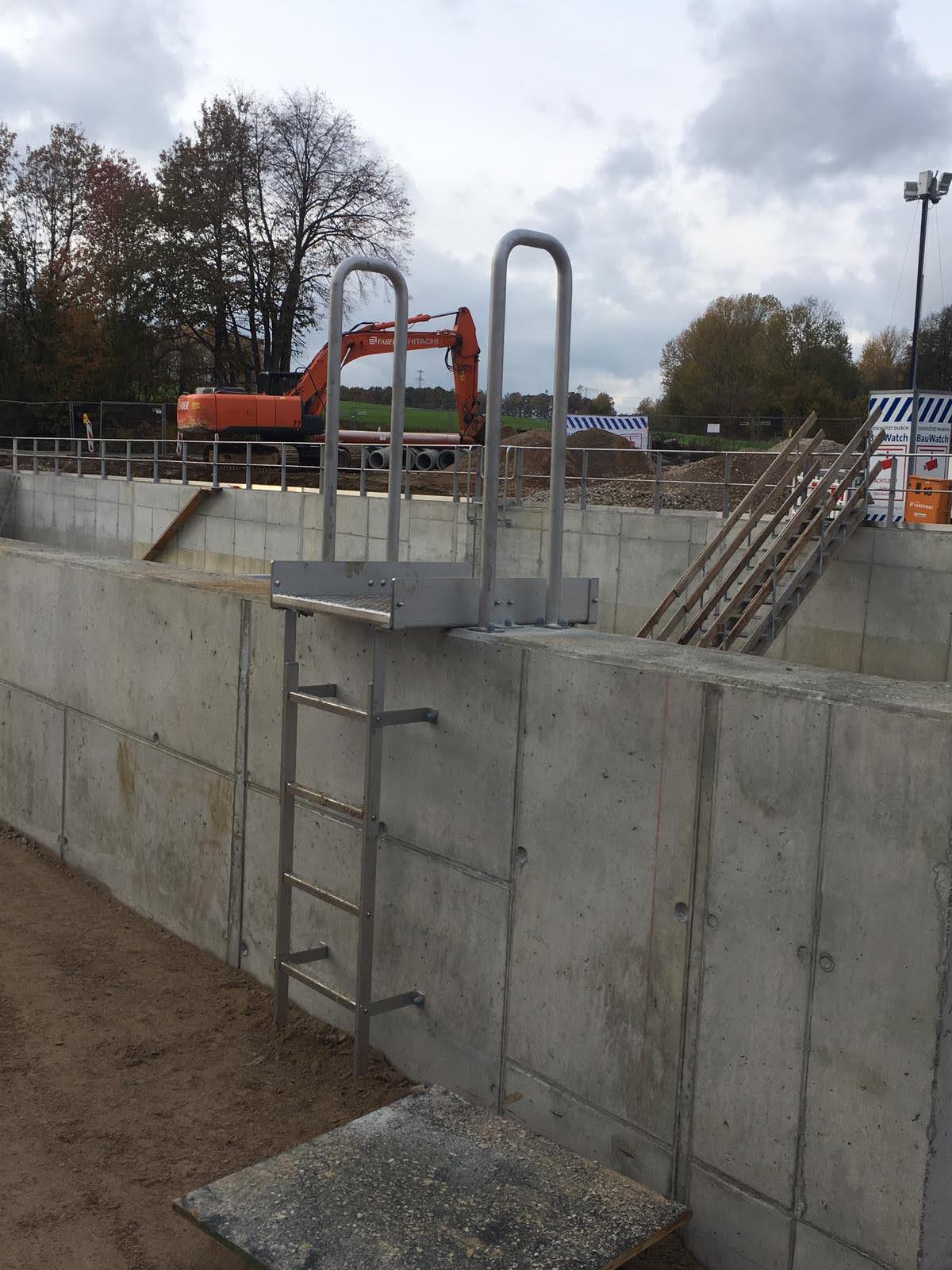 Als Beckenkronenüberstieg mit beidseitigem Haltebügel und verbreiterter Lauffläche für mehr Bewegungsfreiheit, sowie mit erhöhtem Korrosionsschutz und Funktionalität, bestehend aus formschlüssig verschraubten Einzelmodulen, zur Befestigung an dem Holm/ Sprossen-Verbindungssystem aller VA Pro– Einsteigleitern SA04 / SA05 / SA06 hergestellt, im Vollbad gebeizt und passiviert.