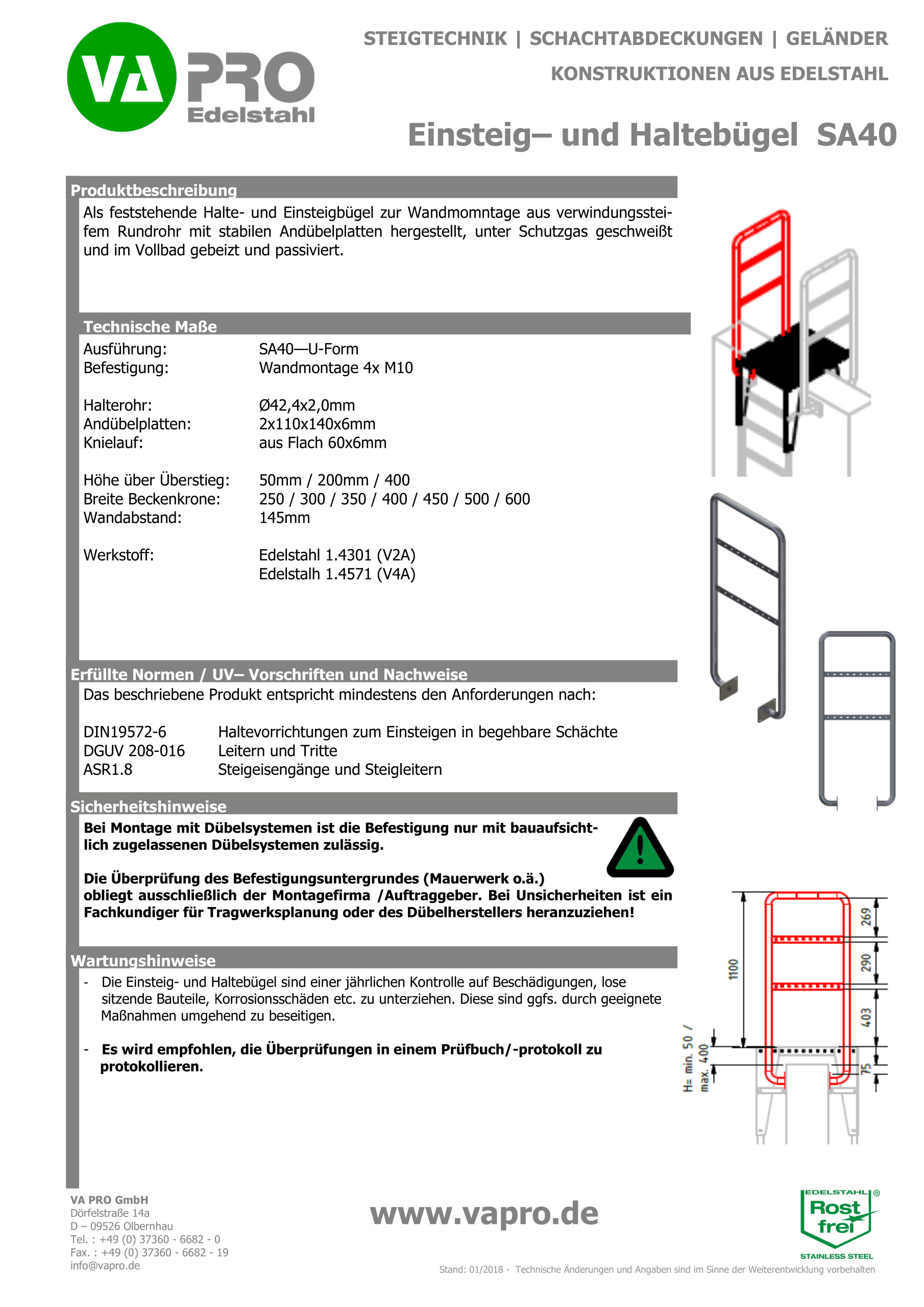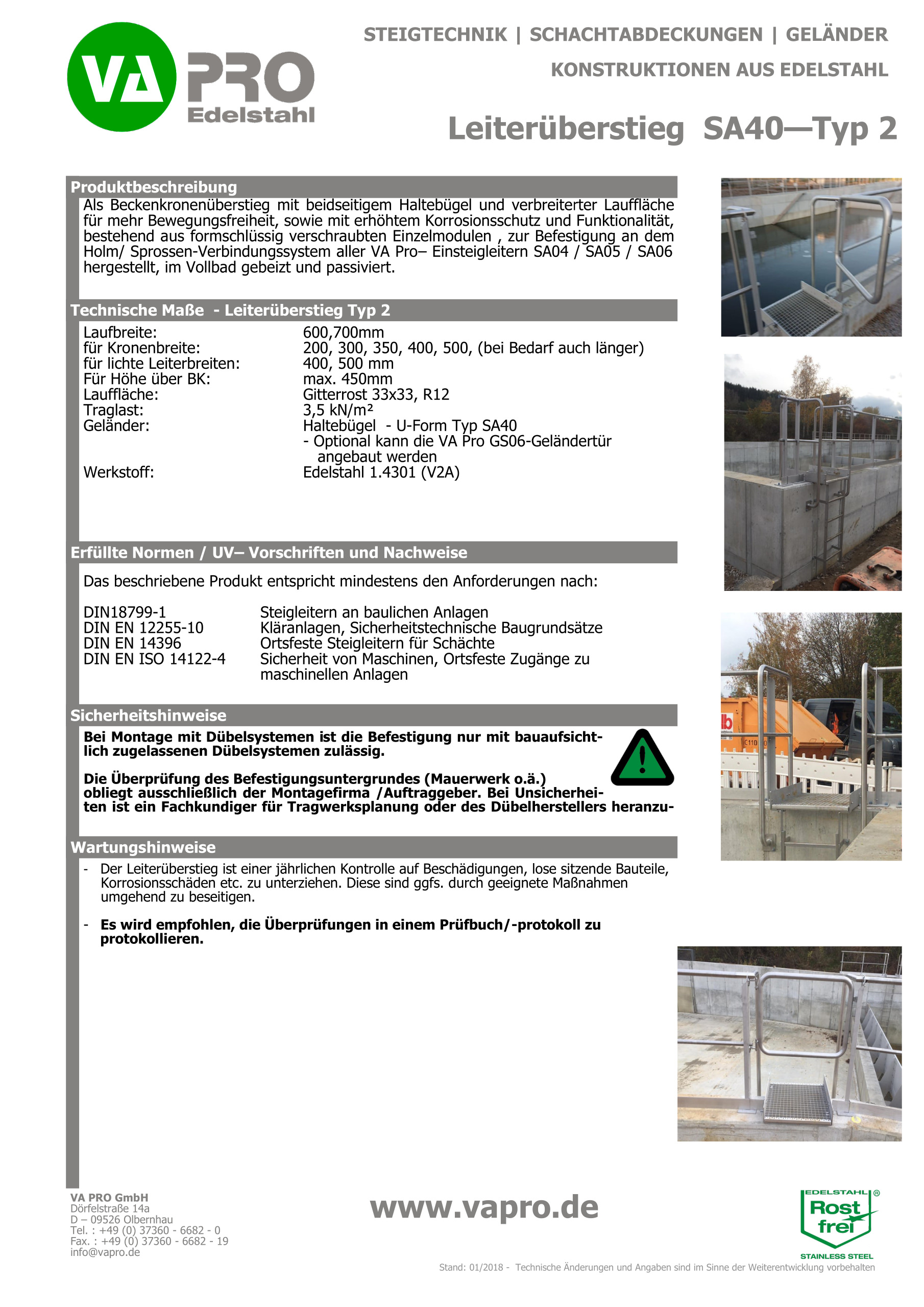 | 600, 700mm | 200, 300, 350, 400, 500, (bei Bedarf auch länger) | 400, 500 mm | max. 450mm | Gitterrost 33×33, R12 | 3,5 kN/m² | Haltebügel – U-Form Typ SA40 – Optional kann die VA Pro GS06-Geländertür angebaut werden |