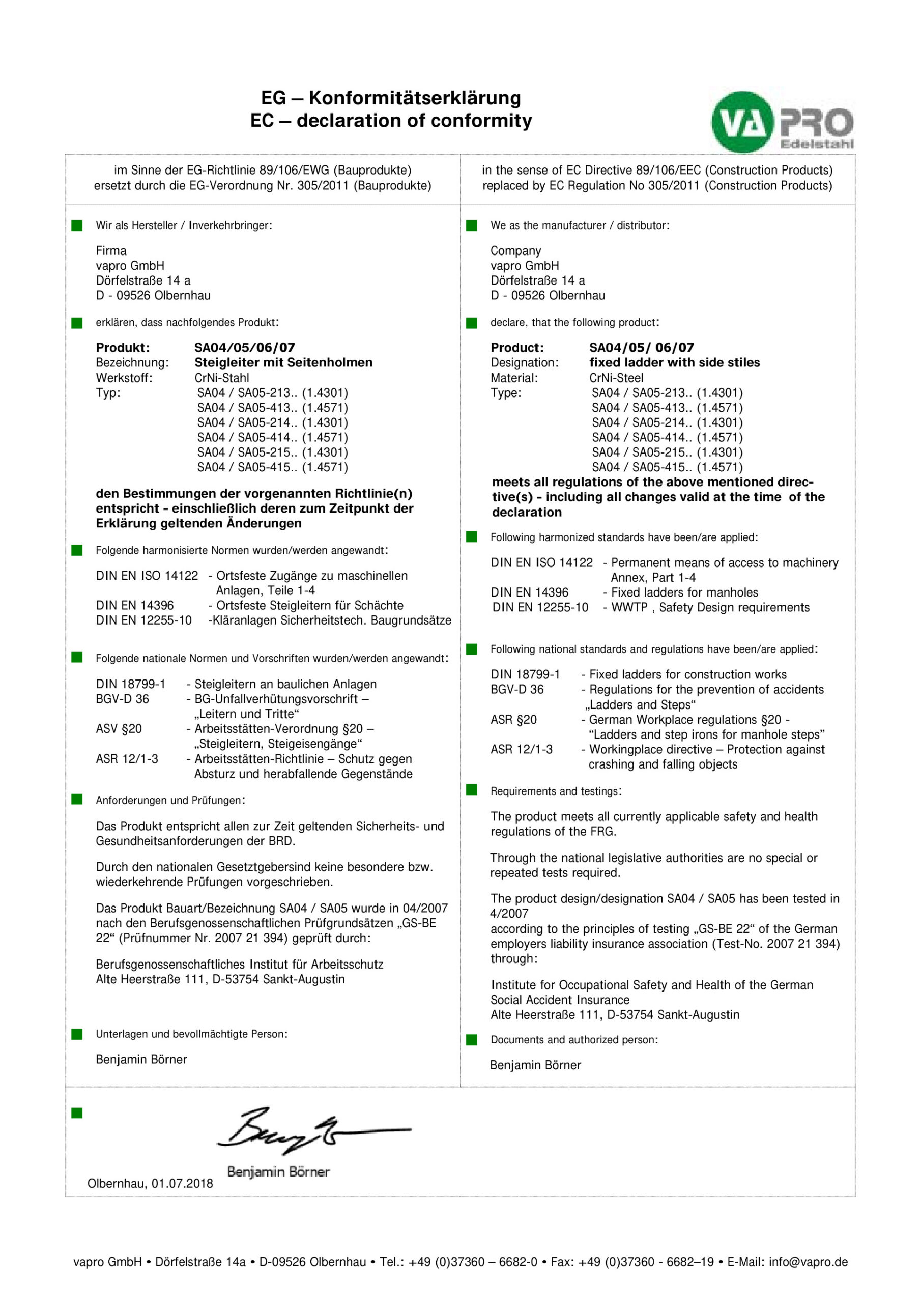 - EN 14396 – ortsfeste Steigleitern in Schächten
