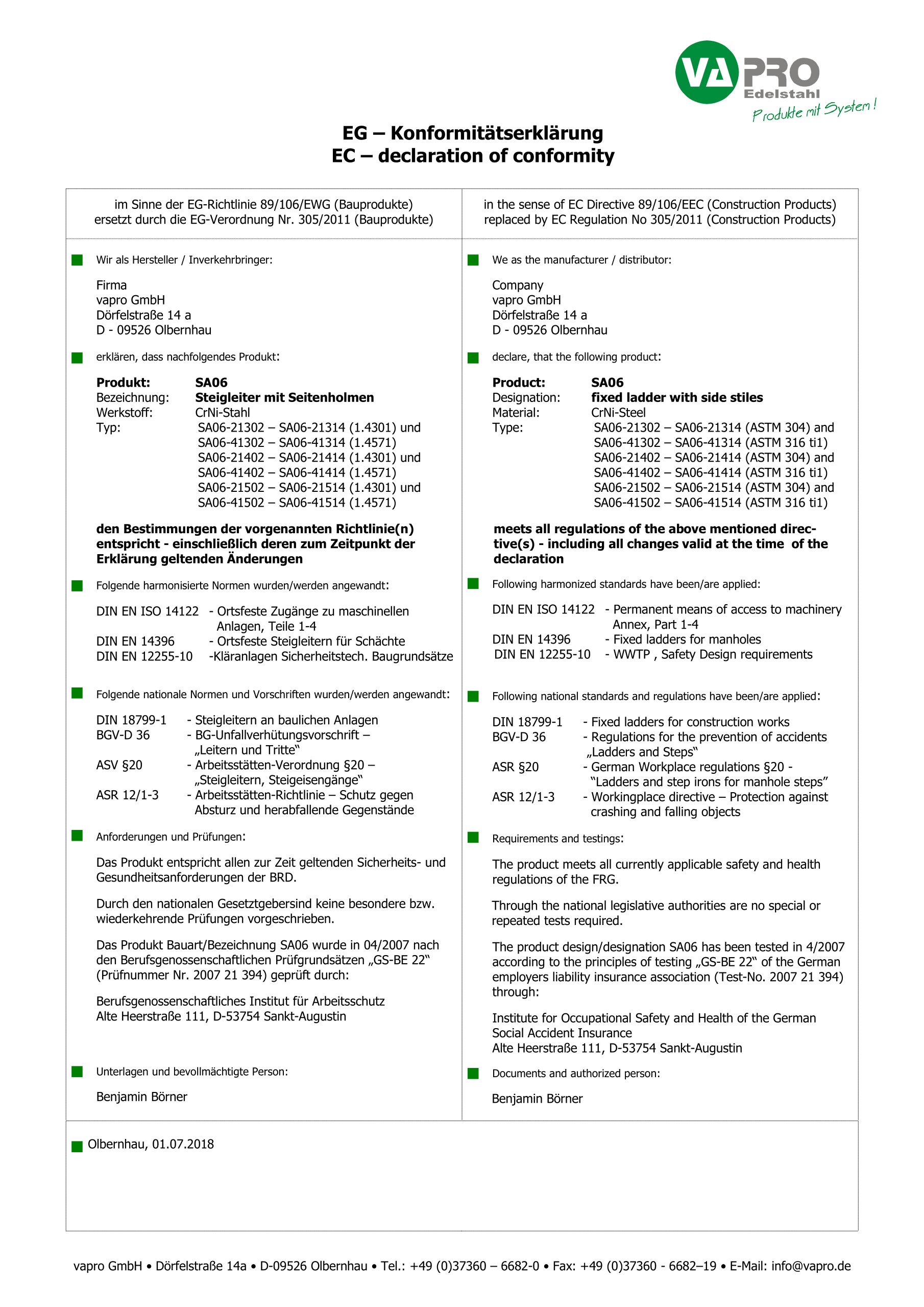 - EN 14396 – ortsfeste Steigleitern in Schächten